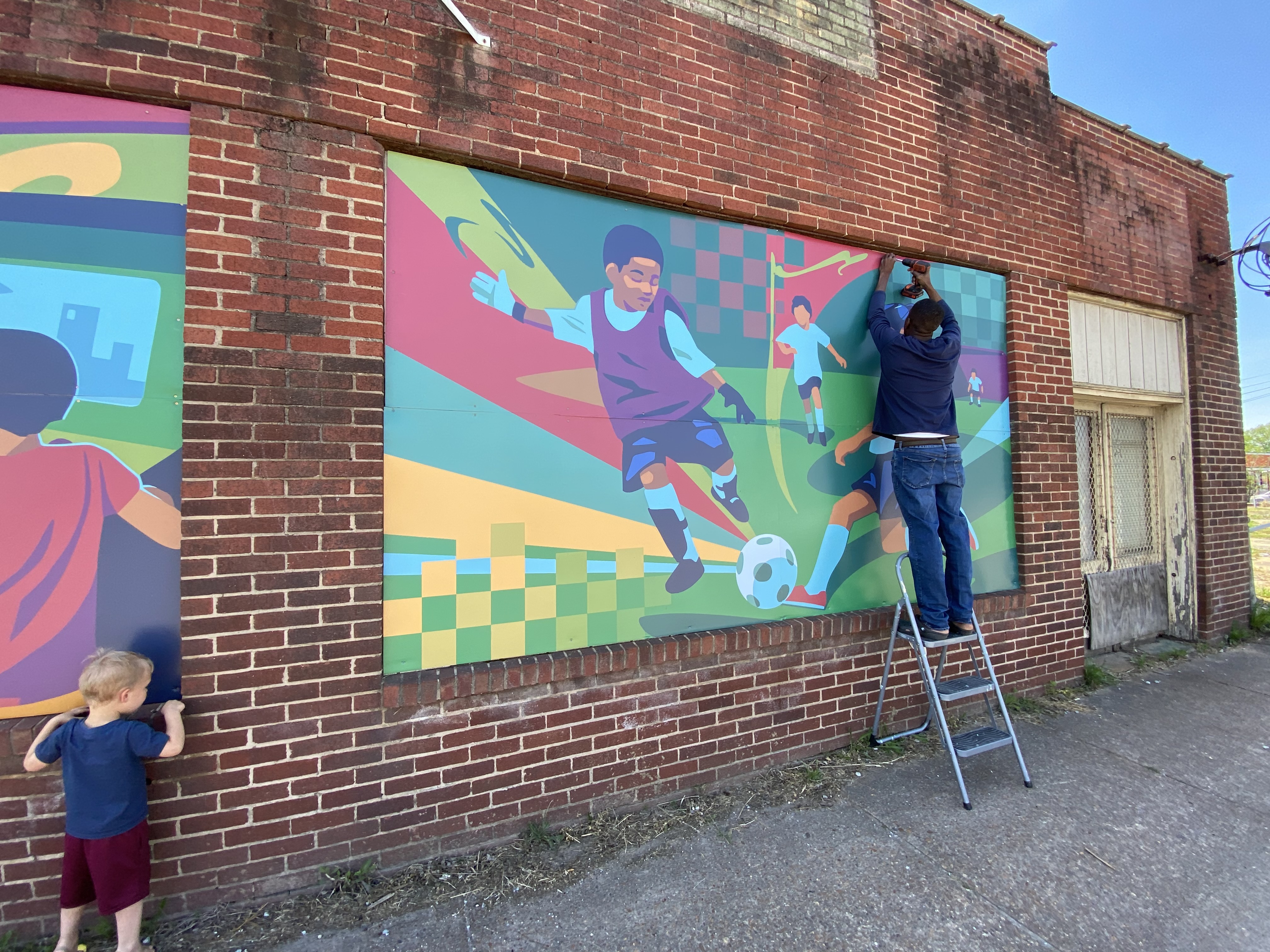 Artwork installed on abandoned buildings.