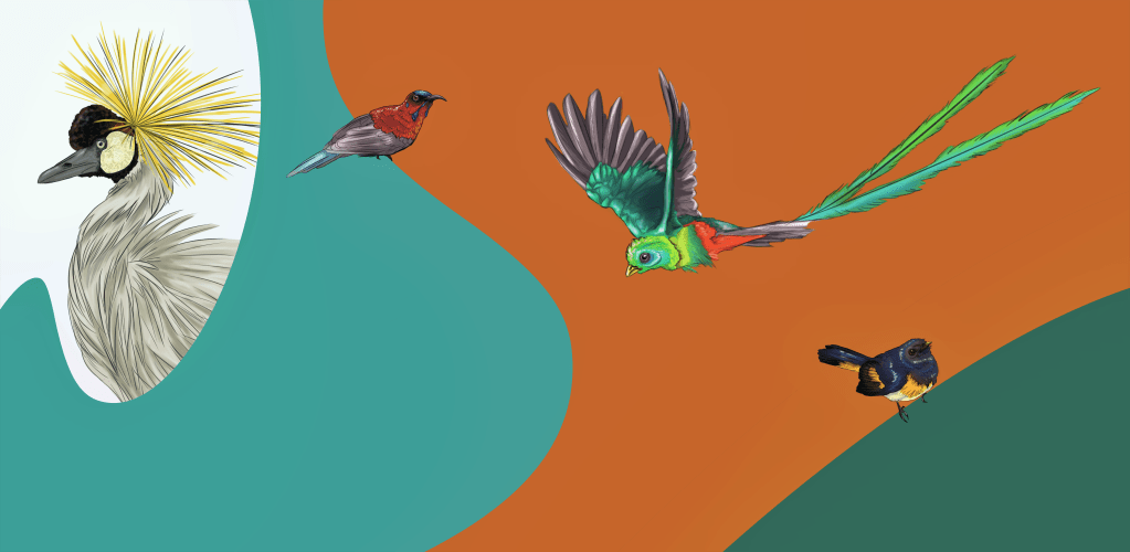 I’m very excited to be part of this project! My piece is a digital painting of several bird species from around the world, I chose each based upon the immigrant and racially diverse populations of the region. The birds included in the design are (from left to right): A Grey-Crowned Crane from Southern Africa, a Crimson Sunbird from Southern Asia, a Quetzal from Central America, and an American Redstart which has a migratory range through both North, Central, and South America. I think this piece shows both a superficial and a metaphorical meaning… it gives an artistic view of exotic birds, but it also represents the human diversity of the area. I also tried to have my color palette match the colors seen along Rossville Blvd on storefronts and signage.